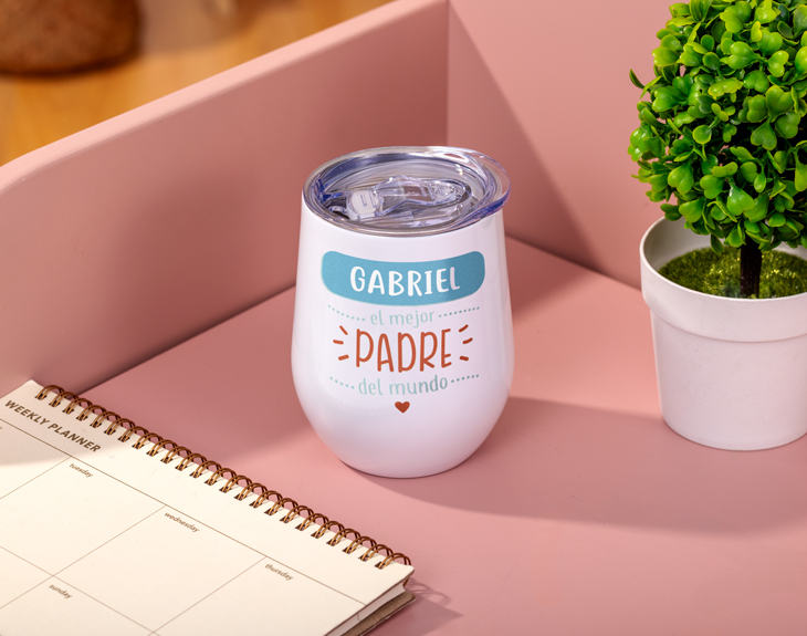 Sabemos que es difícil encontrar ideas para regalar a padres en el Día del Padre o en su cumpleaños. ¿Algo práctico, algo bonito, algo que vayan a usar? ¿Por qué decidir entre todas estas opciones cuando puedes tenerlas todas en un único regalo? Esta taza térmica personalizada será algo que le vendrá muy bien para su día a día. No solo por su conservación del calor o su forma adaptada a la manera de cerrar la mano. Sobre todo, ¡por ese bonito mensaje para el mejor padre del mundo que le alegrará en el trabajo cada día! En esos momentos donde tanta agua bebe, necesitará hacerlo de la manera más cómoda. Para ello, incluimos una pequeña boquilla en la tapa hermética de plástico. Así no tiene que estar abriendo y cerrando como si fuera una botella. Pero lo mejor de esta taza blanca personalizada con nombre a color no es solo su diseño, sino su doble refuerzo de acero inoxidable. Todos los tés o infusiones que se haga en la oficina retendrán bien todo el calor y nutrientes. ¡Sin que se queme la mano al cogerlos! No se merece menos un padre tan genial. Ya sea para esos momentos de relax o para llevar el agua en las excursiones al campo, este vaso ovalado personalizado se convertirá en su nuevo complemento de viaje favorito. ¡También puede ser su vaso de casa preferido! Altura: 12 centímetros. Base: 5,5 centímetros. Borde: 8 centímetros. Capacidad: 360 mililitros. Material: acero inoxidable. Color: blanco. Medidas de la tapa: 7,5 x 8 centímetros. Material de la tapa: plástico reforzado, cerrado a presión. Incluye doble pared. Importante: incluye tapa transparente con boquilla.