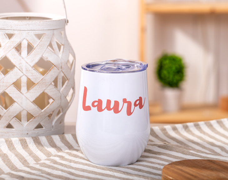 • Vaso térmico blanco personalizado. • Tarjeta recordatoria.