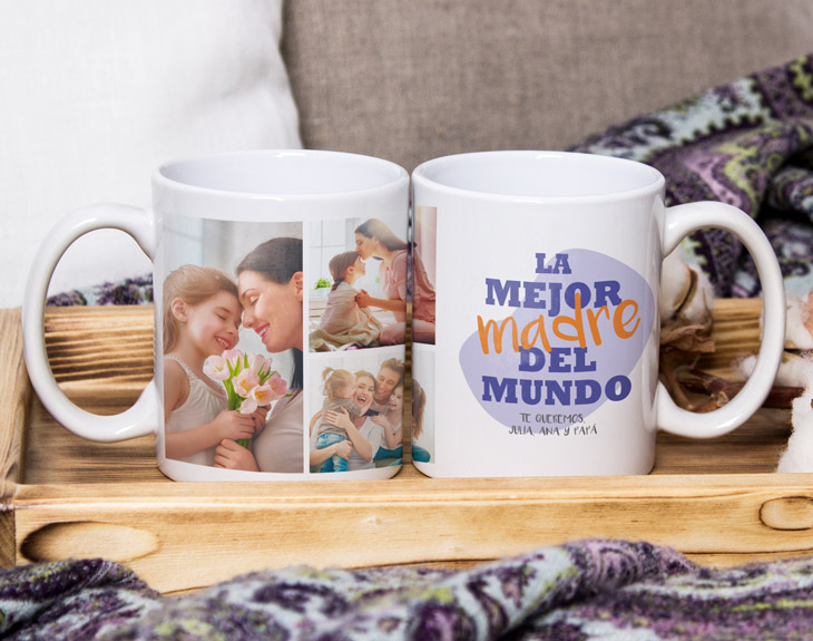 ¿Qué cualidades debe tener la mejor madre del mundo? Este trabajo no tiene tareas fáciles, por lo que esta mujer debe tener toda la fuerza posible para combatir los problemas familiares del día a día. Honestidad, confianza, cariño y mucho, mucho amor son algunas de las características que debe tener una madre perfecta, una mamá que siempre lo da todo por sus seres queridos. Si tu madre encaja a la perfección con esta descripción solo nos queda darte la enhorabuena... ¡Tu madre es la mejor del mundo! Seguro que en tu memoria tienes muchos recuerdos que avalan todas y cada una de las características que la hacen tan especial. ¿Quieres reunirlos todos en un mismo regalo? Esta taza personalizada cuenta con un collage hecho para la mejor mamá. Esta taza con fotos de mamá está hecha de cerámica y cuenta con un diseño hecho especialmente para esa madre increíble. A la hora de personalizar este regalo original solo tendrás que añadir las fotos que quieras a nuestro diseñador. Escoge vuestras mejores imágenes y añádelas a la plantilla. Solo quedará escribirle una dedicatoria en el cuadro de texto que encontrarás en la misma plantilla. ¡Un regalo planeado a medida para la mejor mamá del mundo!