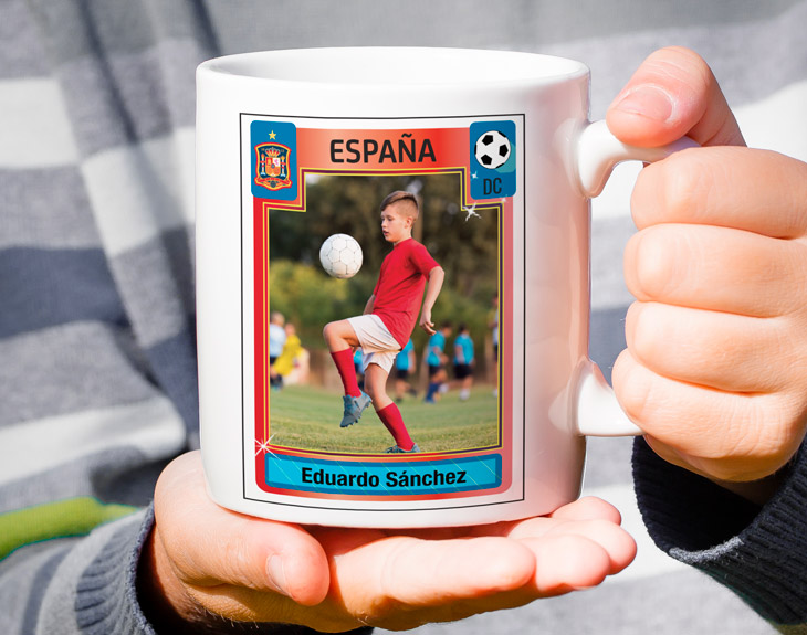 ¿Eres fan absoluto del fútbol? ¿Te gusta compartir tu pasión por este deporte con tu familia y amigos? Si has respondido a todo que sí, te podemos considerar un verdadero fanático de este deporte. Y es que sabemos que el fútbol se disfruta jugando y viéndolo en el estadio o una gran pantalla. Pero como realmente se disfruta es rodeado de gente que siente la misma pasión que tú. ¡Eso no tiene precio! Si has pensado en hacerle un regalo a ese amigo o amiga que se siente como un entrenador de fútbol dando indicaciones desde su casa y que vive cada partido como si fuera el último, esta taza personalizada es perfecta para acompañar los partidos con tu bebida favorita. Ahora, como fanático del fútbol podrás convertirte a ti o a la persona que quieras en un jugador de fútbol y aparecer en un cromo. ¿Cómo puedes personalizar tu taza? ¡Es muy fácil! Podrás elegir el color del cromo que más te guste y añadir una foto y varios textos. Este le encantará a cualquiera que viva y sienta el fútbol.