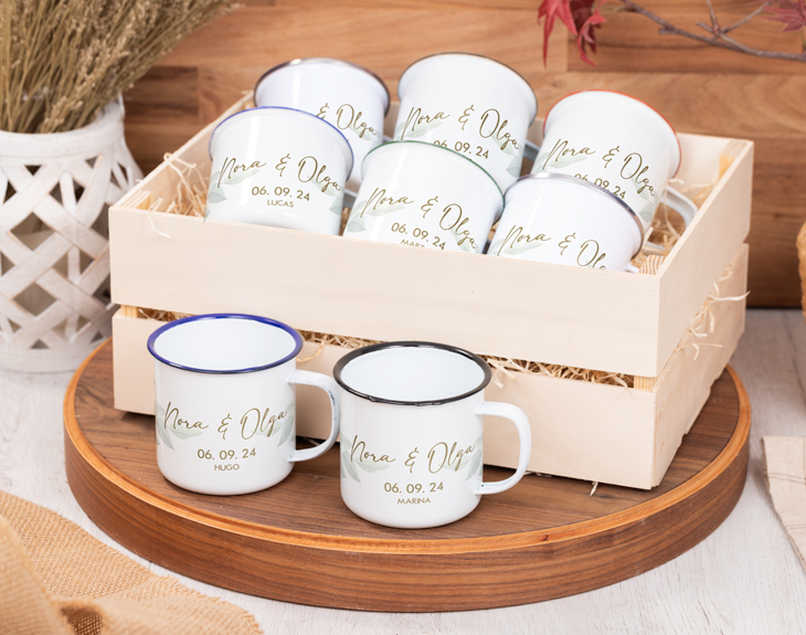 El día más especial de tu vida ha llegado: es el momento de casarte con la persona que más quieres en el mundo. Sin duda, vas a acordarte de esta fecha toda la vida y seguro que quieres que tus invitados también lo hagan. Por eso, sorpréndeles con esta taza enamel personalizada porque será un regalo único y diferente para tus seres queridos. ¡No olvidarán este gran día! Este original regalo es el detalle perfecto para tus invitados, porque esta taza estilo vintage es ideal para toda tu familia y amigos. ¡Además es súper útil! Lo mejor es que podrás elegir cuántas unidades quieres y personalizarlas todas con este precioso y elegante diseño perfecto para el día de tu boda. ¡Dejarás con la boca abierta a todos! No te preocupes porque personalizar estas tazas es muy sencillo. Primero tienes que elegir cuántas tazas quieres y después añadirlas al carrito. Entrarás en nuestro diseñador y desde ahí podrás personalizar estas tazas tan ideales. Elige el diseño que más te guste y complétalo con el texto que quieras. ¡Será el mejor regalo del mundo para este día tan importante! Medidas de la taza: 7,9 cm de alto x 8,9 cm de diámetro. Capacidad de la taza: 380 ml.
