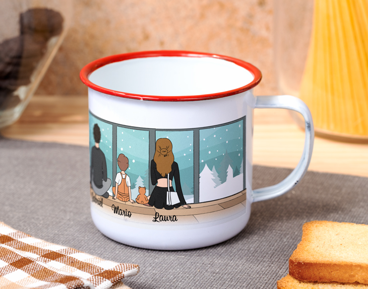 Alégrate cada mañana con el complemento de desayuno más vistoso y el diseño más creativo y original. Si te gustan la naturaleza y los paisajes bonitos, disfrútalos cada vez que te tomes el café o el chocolate con esta taza enamel personalizada. Además, podrás escoger el color que quieras para decorar el borde. Vendrá en su cajita individual lista para sorprender a esa persona especial. Si disfrutas de estar con los tuyos simplemente pasando tiempo juntos y contemplando la naturaleza, este diseño es para ti. Para que los tengas siempre contigo, puedes crear a tus familiares y amigos con los más de 300 personajes de chilling de espaldas disponibles. ¡Con todas las edades, colores y tamaños! Verás qué bonitos quedan en tu taza personalizada con el fondo de paisaje nevado y vuestros nombres. Importante: Se pueden escoger hasta un máximo de 6 personajes que aparecerán en la misma línea. IMPORTANTE: las tazas enamel son un producto vintage. Se fabrican una a una simulando ser un producto envejecido, por lo que todas tienen falsos defectos de textura y color. Está fabricada en acero inoxidable con recubrimiento de esmalte cerámico, por lo que no es una taza apta para calentar en el microondas. Medidas de la taza: 79 mm de alto x 89 mm.