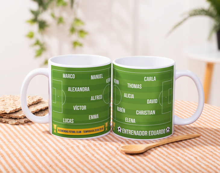Nuestra taza personalizada con los mejores jugadores de fútbol es perfecta para darle una sorpresa a tu entrenador. Si este año has empezado en un equipo de fútbol, y te lo has pasado súper bien, tu entrenador se merece un detalle como este. Seguro que el míster ha trabajado mucho para que ganaseis el campeonato, por lo que se merece una sorpresa a lo grande. Dinos todos los nombres de los jugadores, el nombres del entrenador y algún mensaje de agradecimiento que le quieras poner y personalizaremos la taza para que tengas un regalo original estupendo. Imagínate al entrenador desayunando antes de cada partido con el nombre de todos sus jugadores. ¡Le encantará la sorpresa!