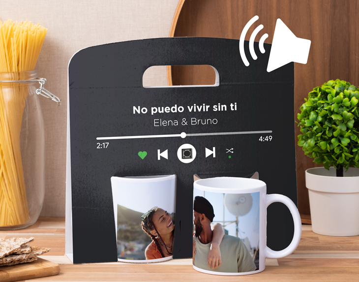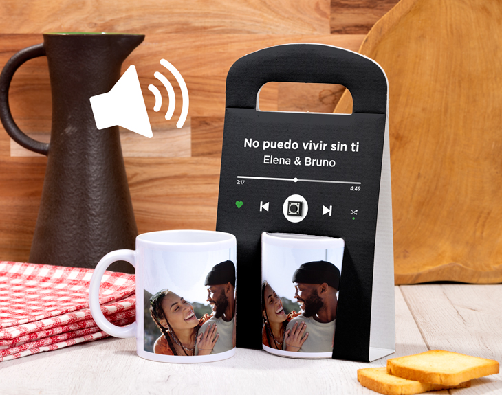 Seguro que tienes una foto especial con esa persona a la que te gustaría acompañar en cada café diario. Y a veces, la mejor forma de revivir esos momentos tan especiales no es solo mirándola, sino también con una canción que capture a la perfección ese recuerdo. Por eso, nuestras tazas con estuche reproductor personalizado con diseño "Spotify" son el detalle ideal para sorprender a esa persona tan especial. Perfectas para empezar cada día con una sonrisa, mientras disfrutas de un café o un chocolate al ritmo de vuestra canción favorita. Lo mejor de estas tazas es que el estuche también es un reproductor de música. Además de personalizarlo con el diseño de "Spotify", podrás añadir la canción que más te recuerde a esa persona que recibirá este regalo único. Así, cada vez que lo desee, podrá pulsar el botón en el estuche y escuchar esa melodía especial. ¡El regalo perfecto para un cumpleaños, amigo invisible, un aniversario o San Valentín! Personalizar estas tazas con estuche audio es muy sencillo. El primer paso es añadir el producto a tu carrito y entrar al área de personalización. Luego, tendrás dentro del diseñador los apartados para personalizar las tazas y el estuche a tu gusto. Para la parte del audio, podrás añadir desde un mensaje de voz hasta tu canción favorita en formato MP3, ya que solo tienes que subir el archivo al sistema y listo. ¡Es el detalle perfecto para cualquier ocasión! Medidas del estuche individual: 25,5 cm x 15 cm. Medidas del estuche doble: 26,5 cm x 25,5 cm. Cómo reproducir el audio: para poder reproducir el audio, solo tienes que presionar el lugar exacto que te indicamos en la imagen del producto. Importante: Estos estuches reproductores son recargables. Su batería, situada en la parte trasera, te permite conectar un cable USB de tipo C.