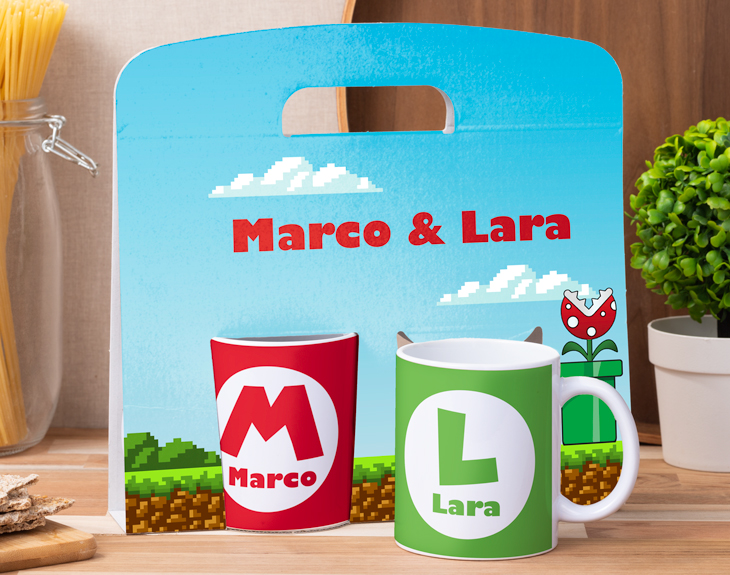 ¿Te acuerdas de esas tardes enteras jugando al Supermario Bros? ¡Es muy divertido! Intentar rescatar a la princesa Peach del malvado Browser era súper entretenido. Si para ti es el mejor videojuego de todos, tenemos algo que te va a encantar. Se trata de nuestras tazas con estuche personalizadas "Supermario Bros". Y lo mejor de estas tazas es que son personalizables, podrás escribir el nombre que tú quieras junto con la inicial. ¡Quedará genial!. Además, tiene un estuche con un estampado inspirado en el Mario bros. Si conoces a esa persona súper fan de este videojuego, estas tazas con estuche se pueden convertir en un original regalo. Personalizar estas tazas es muy sencillo. El primer paso a seguir consiste en añadir el producto al carrito y entrar al área de personalización. Una vez ahí, ya puedes escribir el nombre e inicial que tú quieras. Pronto estará perfecta y lista para regalar. ¡Será un original regalo! Medidas del estuche individual: 25,5 cm x 15 cm. Medidas del estuche doble: 26,5 cm x 25,5 cm.