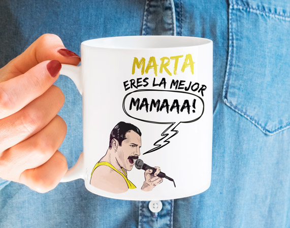 La taza personalizada para el desayuno más rockero. ¿Cuántas veces has desayunado con Freddie Mercury sonando en tu radio? Si han sido más de cien mañanas, tu casa es apta para recibir esta taza tan molona. Regálasela a tu madre. Dinos su nombre y la personalizaremos al 100% para que puedas darle una sorpresa de miedo. Es un regalo espectacular para que todas las mañanas se eche a llorar de la risa. ¡Haz que tu madre viva feliz y empiece los días con energía! ¿Qué más se le puede pedir a un hijo?