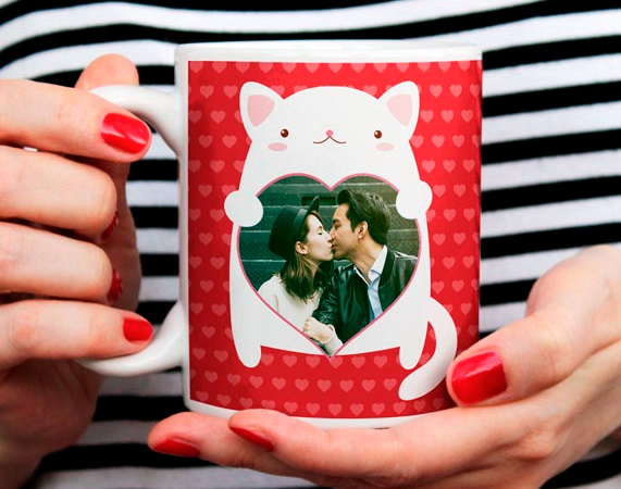 Personaliza una taza con vuestra foto, pero no de cualquier manera: en un marco con forma de corazón sujetada por un gatito amoroso. Perfecta para que todos los desayunos sean románticos.