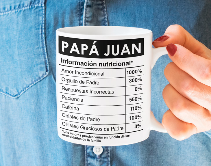 El desayuno es la comida más importante del día. Todos necesitamos un buen café o té para empezar el día con fuerza y ganas de comernos el mundo. Para ello, nos convendría llevar una dieta equilibrada, y alimentarnos bien durante la mañana. Necesitamos la cantidad justa de todo.... ¡incluso de padre! Esta taza personalizada os dejará claro a tu padre y a ti cuales son los ingredientes ideales para tener el padre perfecto. Hay algunos aspectos comunes en todos los padres: esos chistes que te dejan en evidencia, la paciencia, la sabiduría o el amor incondicional que siente hacia sus hijos. Para que no se olvide de lo que le hace ser cómo es tenemos esta taza, en el que se verán reflejados todas las cantidades necesarias que necesita tu padre para ser tan perfecto. Alégrale las mañanas con un regalo original como este. ¿Quién necesita cafeína cuando tienes un padre con tantos nutrientes? Además, podrás personalizar la taza añadiendo su nombre. A nosotros no se nos ocurre un detalle más divertido y personal.