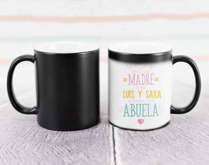¿Acaso existe una persona más tierna y genuinamente buena que nuestra abuela? Estas increíbles mujeres han sido las que nos han dado su cariño incondicional en cualquier momento. Estamos de acuerdo en que esas tardes de cartas y merienda no son fáciles de olvidar, ni tampoco esos banquetes que te preparaba cada vez que ibas a visitarla. Además, seguro que vuestras madres son también unas abuelas increíbles con vuestros hijos. En estos tiempos que corren, los abuelos son lo más grande que tenemos, y hay que cuidarlos siempre. Si quieres que la mejor abuela de tus hijos tenga un regalo especial este Día de la Madre, creemos que esta taza mágica personalizada la sorprenderá en todos los sentidos. Esa magnífica madre y abuela debe ser toda una joya, una mujer capaz de cualquier cosa, y que cuida a sus seres queridos de una manera especial. Gracias a este regalo original, la abu podrá desayunar de una manera única... ¡con un diseño que aparecerá mágicamente! Importante: La taza es apta para microondas. Importante: esta taza NO es apta para el lavavajillas. Puede perder el color negro de la superficie.