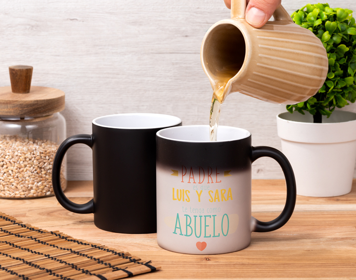 Llega el día del padre o el cumpleaños de tu abuelo y seguro que tienes muchos mensajes muy bonitos para él. ¿Has pensado en todas las formas originales y bonitas que hay de decirle lo especial que es? Una que le dejará boquiabierto es esta taza mágica personalizada. A primera vista parecerá una taza completamente negra. Sin embargo, conforme le eches líquido caliente, ¡irá apareciendo el mensaje oculto! ¿Tu fantástico padre es también un increíble abuelo? Recuérdaselo cada mañana o cada tarde cuando llegue la hora del café. Para ello, lo único que tienes que hacer es decirnos el nombre de sus nietos. ¡Mira en la previsualización lo bonito que quedará el mensaje lleno de colores! Será un sorprendente regalo original para padres y abuelos. Dale un toque de originalidad y alegría a las mañanas de tu padre o abuelo con esta taza con nombre. La capacidad es de 300 mililitros. Importante: La taza es apta para microondas. Importante: esta taza NO es apta para el lavavajillas. Puede perder el color negro de la superficie.