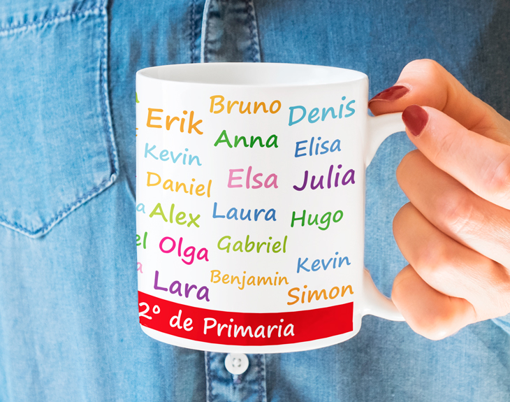 ¿Termina el curso y queréis tener un recuerdo? ¿Ha llegado el momento de hacerle un regalo a vuestro profe? Con esta taza con nube de palabras tendrás algo único e irrepetible. Envíanos los nombres, dinos qué grupo es (una clase, un equipo de fútbol o cualquier otra cosa) y te la preparamos. Al adquirir el producto (y antes de pagar) se te preguntarán los nombres y la clase para la taza. Al comprar este diseño podrás elegir el tipo de taza que quieres entre nuestras seis opciones disponibles en el desplegable: cerámica, mágica, plástico, con el interior en color, con cuchara o con asa en forma de corazón. En el lado derecho encontrarás la guía de tazas con las características de cada una de ellas. ¡Escoge el estilo y la cantidad de tazas que quieras!