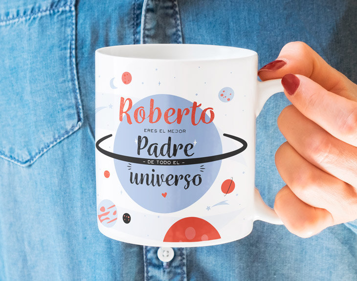 ¿Tu padre es más de café o té? Tal vez le guste tomarse un café calentito por las mañanas, antes de ir al trabajo; o puede que quiera relajarse antes de una larga jornada laboral con un té. Sea como sea, un buen desayuno es necesario para poder rendir durante todo el día. Si quieres que el mejor padre del universo tenga una mañana de lo más feliz, esta taza personalizada es el detalle ideal. Esta taza no es una taza cualquiera. Es el símbolo de todo lo que ha hecho por ti a lo largo de los años. ¿Recuerdas cuando te levantaba y te hacía el desayuno todos los días? ¿o cuando te llevaba a comer tu comida favorita? Esos son los momentos más destacables de tu vuestra relación, y los que prueban que tu padre ha sido una persona extraordinaria a lo largo de los años. En este galáctico diseño, podemos ver un espacio repleto de planetas. Porque sí, tu padre es el mejor padre de todo el universo, y por eso se merece un regalo original como este. Añade su nombre al diseño y así será un detalle mucho más único. ¡El mejor padre del universo se emocionará!