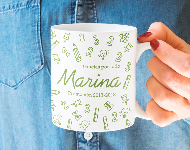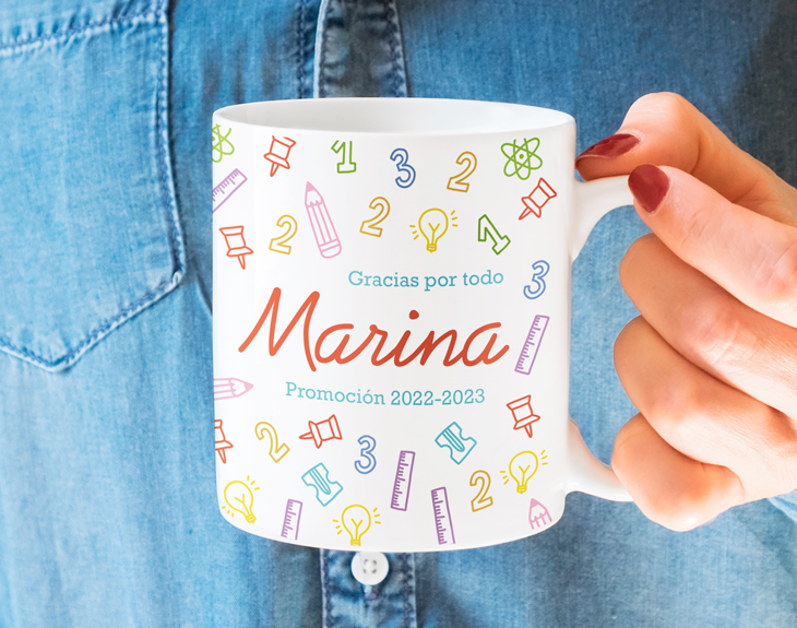 Hay valores que hacen que un profesor o profesora sea alguien único. El cariño con el que enseña, la paciencia que tiene con todos los alumnos, la vocación que muestra en cada clase... Si has tenido la suerte de tener al mejor profe del mundo, tu clase y tú podéis sorprenderle con esta taza personalizada. Es un regalo único y muy especial con el que se acordará de sus alumnos favoritos siempre que la utilice para desayunar. ¡Es un detalle precioso para fin de curso! Si como alumnos queréis agradecer todo el esfuerzo que ha hecho vuestro profe durante todo el curso, no hay mejor manera de hacerlo que con esta original taza. Su diseño es perfecto para cualquier profe porque le hará recordar todo lo que le gusta y es que todos los dibujos que hay tienen que ver con el colegio y la enseñanza. ¡Un regalo con el que se emocionará! Personalizar esta taza es súper fácil. Añade el producto al carrito, entra en el área de personalización y comienza a crear tu diseño. Podrás elegir el color del diseño (verde, azul, amarillo, rosa o multicolor) y después añadir el texto que quieras. Inspírate en la imagen o deja volar tu imaginación. Nosotros nos encargamos del resto y nos aseguramos que quede perfecta y lista para usar. ¡Se convertirá en su taza favorita! Al comprar este diseño podrás elegir el tipo de taza que quieres entre nuestras seis opciones disponibles en el desplegable: cerámica, mágica, plástico, con el interior en color, con cuchara o con asa en forma de corazón. En el lado derecho encontrarás la guía de tazas con las características de cada una de ellas. ¡Escoge el estilo y la cantidad de tazas que quieras!