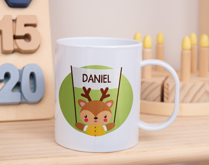 Una taza de plástico personalizada de animales para la niña amante de estos pequeños. Este adorable ciervo le acompañará todos los días en el colegio, siempre con una sonrisa, e invitándole a merendar, comer y beber agua. Se trata de un regalo para la Vuelta al cole muy especial, sobre todo, si tu hija adora a los animales. ¿Le preocupa la naturaleza y la supervivencia de los ciervos? No dudes más y sácale una sonrisa. ¡El ciervo llevará una pancarta con su nombre! Importante: El plástico de la taza no contiene BPA. Esta taza es apta para lavavajillas y microondas.