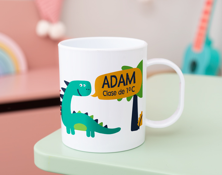 Un regalo original para el niño que empiece las clases ahora. Se trata de una taza de plástico personalizada con el nombre de tu hijo y un texto inferior, como por ejemplo, el curso que va a empezar este año. Es un detalle muy bonito para ese niño que ha disfrutado de las vacaciones y que quiere empezar a estudiar con una sonrisa. El dinosaurio se convertirá en su mejor amigo y acompañante en sus horas de clase. Importante: El plástico de la taza no contiene BPA. Esta taza es apta para lavavajillas y microondas.