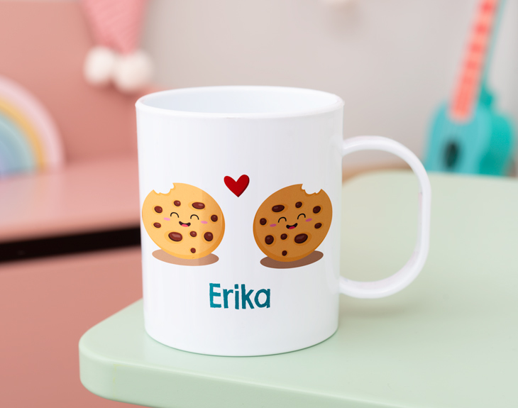 Una taza de plástico personalizada con un diseño riquísimo para quien las galletas le vuelvan loca. Un regalo original para que tu niña pueda beber agua de manera divertida en el comedor del colegio. También se puede utilizar para el desayuno. Si tu hija es de las que unta galletas en la leche, no puede haber un regalo más divertido que este. Antes de pagar, te preguntaremos por su nombre para que podamos personalizar el producto al máximo. Importante: El plástico de la taza no contiene BPA. Esta taza es apta para lavavajillas y microondas.