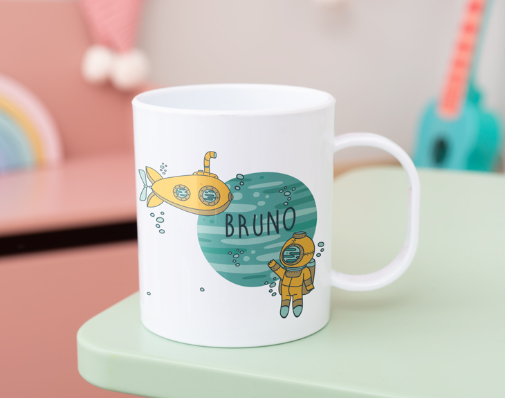 La Vuelta al Cole está a la vuelta de la esquina, y por eso, hemos diseñado esta taza infantil para los pequeños submarinistas. Si tu niño está pensando en bucear, en la playa de este verano y en ver muchísimos peces diferentes bajo el mar, esta taza de plástico personalizada le gustará muchísimo. Es perfecta para merendar al salir del cole, o para beber agua en el comedor. Dinos el nombre de tu hijo y personalizaremos la taza para que vaya muy contento al cole. Importante: El plástico de la taza no contiene BPA. Esta taza es apta para lavavajillas y microondas.