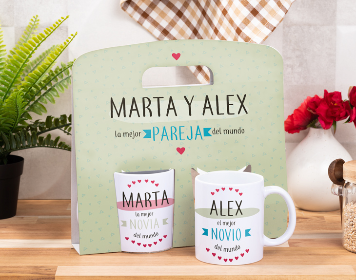 Si tienes unos amigos que hacen una pareja increíble y crees que están a puntito de casarse, este regalo original seguro que les anima a hacerlo. Se trata de un estuche personalizado muy romántico con dos tazas para el mejor novio y la mejor novia del mundo. ¡Morimos de amor! Solo necesitamos los respectivos nombres y tendrás las tazas con estuche listas para dar una sorpresa a mejor pareja del mundo. Medidas del estuche: 26,5 cm x 25,5 cm.
