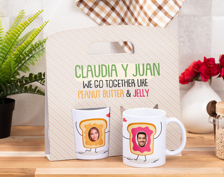 Se nos hace la boca agua solo con pensar en una tostada de mantequilla de cacahuetes y mermelada. No hay nada que se complemente mejor...¿o sí? Si tu pareja y tú formáis incluso mejor equipo que estos dos alimentos, estas tazas personalizadas están hechas para vosotros. Se trata de un regalo muy original y divertido para dejar sin palabras a tu compi de aventuras y de vida. ¿Nunca habías encajado tanto con alguien?¿Sobran las palabras para entenderos? Si juntos sois mucho más fuertes, estas tazas tan graciosas tienen vuestro nombre. Solo necesitamos que escojas las fotos más divertidas y nosotros nos encargamos de hacer que sea el detalle más increíble del mundo. ¡Seguro que no se lo espera y al verlo se parte de risa! Medidas del estuche: 26,5 cm x 25,5 cm.