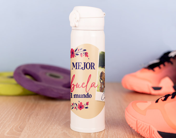 La mejor abuela del mundo siempre tiene que estar muy bien hidratada, sobre todo durante el verano. ¡El calor puede llegar a ser agotador! Este termo personalizado le vendrá de gran ayuda durante sus paseos mañaneros o sus excursiones con amigas. ¡Siempre llevará un recuerdo de su familia allá donde vaya! Si tu abuela es toda una aventurera no se nos ocurre un regalo más apropiado para ella que este termo de acero inoxidable con diseño Polaroid. ¡Podrá rellenarlo con su bebida favorita! Seguro que saciará su sed sin problema gracias a su capacidad de 400 mililitros. Cuenta con una altura de 22,5 centímetros, por lo que podrá llevarlo a cualquier parte sin problema. Un regalo original para abuelas como este irá personalizado de la forma más emocionante, gracias a su diseño dedicado a las míticas fotos Polaroids. En el diseñador encontrarás dos diseños entre los que elegir, uno protagonizado por un texto y otro para añadir vuestra foto favorita. ¡Clica sobre el cuadro de texto o imagen para personalizar tu producto! Altura de la botella: 22,5 cm. Diámetro de la base: 6 cm. Capacidad: 400 ml. Colores disponibles: negro, blanco y plateado. Material: Acero inoxidable.