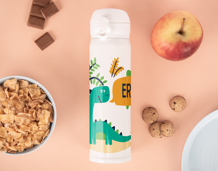 Los más pequeños de la casa siempre tienen una energía envidiable para afrontar cada semana y todos sus largos e interminables días. Se levantan para ir al colegio, comen, juegan, vana las actividades extraescolares, hacen deberes... ¡No paran nunca! Es importante que pasando tanto tiempo fuera de casa, se lleven todo lo necesario para afrontar cualquier día. Por eso, no les puede faltar este termo personalizado para llevar agua o su bebida favorita allá donde vayan y mantenerse siempre bien hidratados. Será su accesorio favorito porque aguantará el ritmo de cualquier pequeño terremoto. Seguro que a tu hijo o hija le hace mucha ilusión poder tener su propia botella para llevarla donde quiera. Por eso, no hay mejor opción que este original termo de acero inoxidable que podrán personalizar con este diseño tan divertido y único. Es la mejor alternativa para no usar botellas de plástico porque es muy útil para poder transportarlo donde sea y tenerlo siempre a mano. Está hecho de acero inoxidable, que lo hace muy resistente y puede mantener cualquier bebida fría o caliente. Y lo más importante es que su tapa cuenta con cierre de seguridad para evitar que se derrame el líquido del interior. ¡Es perfecto para aguantar el ritmo de los niños! Lo mejor de este producto es que podéis personalizar este termo a vuestro gusto. Si queréis hacerlo en familia, es muy sencillo. Añade el producto al carrito, entra en el apartado de personalización y manos a la obra. Solo tenéis que escribir el nombre que queráis y colocarlo a vuestro gusto en este divertido diseño de un adorable dinosaurio rodeado de naturaleza y plantas. Además, podéis elegir el color que más os guste: negro, blanco o plateado. ¡Personalizar este termo en familia con los más pequeños será un momento muy divertido! Altura de la botella: 22,5 cm. Diámetro de la base: 6 cm. Capacidad: 400 ml. Colores disponibles: negro, blanco y plateado. Material: Acero inoxidable.
