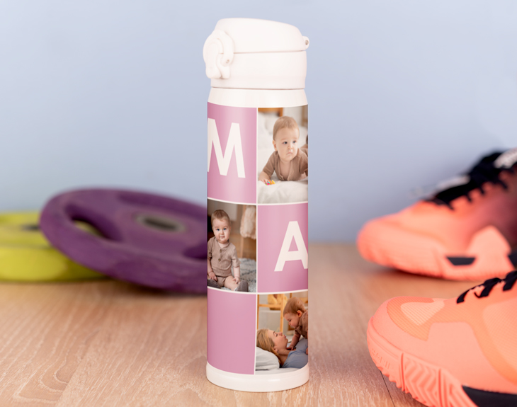 ¿Tienes a la madre más deportista en casa? Si no hay un solo día en el que mamá no vaya al gimnasio o en el que esté continuamente para arriba o para abajo, este termo personalizado le ayudará a superar cualquier rutina con una sonrisa en la cara. ¡No podrá no acordarse de su familia cada vez que contemple este detalle tan bonito y sentimental! Como queremos sorprender a tu madre con un regalo muy especial... ¿Por qué no hacerlo con este termo para hacer deporte con diseño de mamá? ¡Contiene varios de vuestros recuerdos más felices! Al contar con una altura de 22,5 centímetros y una capacidad de 400 mililitros, este termo cuenta con las medidas perfectas para llevarlo a cualquier parte. Contamos con tres colores distintos para este termo: negro, blanco o plateado. ¡Podrás escoger el que más te guste! Este mosaico será el completo protagonista de este regalo original para mamá. ¡Estamos seguros de que le emocionará! Al añadir el producto al carrito podrás acceder al área de personalización y escoger el color de la botella que quieras. Después solo tendrás que escoger el diseño del mosaico que más te guste... ¡Y añadir las fotos que quieras al sistema! Altura de la botella: 22,5 cm. Diámetro de la base: 6 cm. Capacidad: 400 ml. Colores disponibles: negro, blanco y plateado. Material: Acero inoxidable.