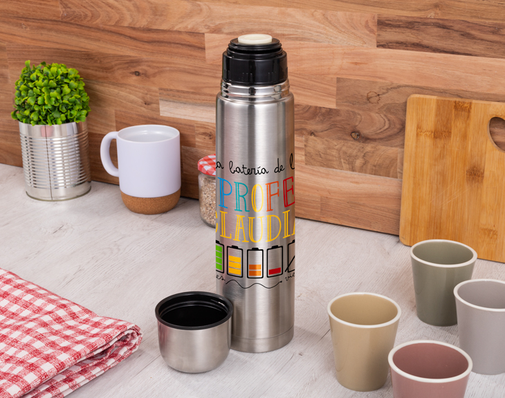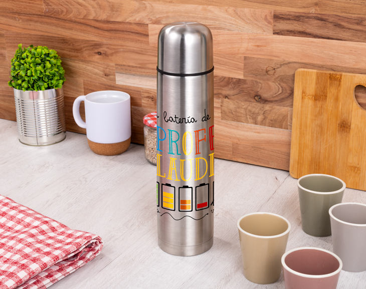 ¿Qué sería de los profes sin su café? Una buena taza de café es lo que más necesitan cada mañana para poder afrontar el día con mucha energía. Ahora que llega el final del curso y hay que prepararse para el siguiente, el mejor regalo que le podéis hacer a vuestro profe favorito es: ¡nuestro termo personalizado! Es el accesorio perfecto para tener su café bien calentito siempre a mano o la bebida que más le guste. ¡Lo llevará todos los días a clase! El café es la bebida perfecta para recargar las pilas de los profes, que a veces parece que no se acaban. Por eso este original termo de 1 litro tiene el diseño perfecto para los profes, porque les representa al cien por cien. Pero lo mejor de este termo es que está hecho de acero inoxidable, es súper resistente y puede mantener las bebidas frías o calientes durante mucho tiempo. Además, cuenta con un tapón hermético y un sistema de apertura y cierre con pulsación para evitar derramar el líquido del interior. ¡Es el regalo perfecto! Lo que caracteriza este regalo es su diseño, por eso no puedes olvidarte de personalizando este termo. Es tan sencillo que solo tienes que añadir el producto al carrito, entrar en el área de personalización y completar este divertido diseño con el nombre de tu profe. Una vez haya hecho todo esto, el regalo ya estará listo para entregar. ¡Es ideal para el último día de curso! Importante: No es apto para microondas, horno o lavavajillas. Altura de la botella: 32 cm. Diámetro de la base: 8 cm. Capacidad: 1 litro. Material: Acero inoxidable.