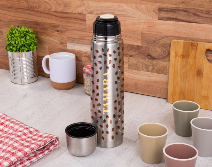 El termo personalizado perfecto para todas aquellas personas que no pueden vivir sin su litro de café diario, ¡ahora podrá tener siempre su taza con la temperatura perfecta! Sin duda, el regalo original que todo/a cafetero/a necesita en su vida. Además, cuenta con un precioso diseño lleno de granos de café, y lo más importante de todo, ¡podrás personalizarlo con su nombre! Así no habrá duda de cuál es su café. Se trata de un elegantísimo termo de acero inoxidable de color plata, y no solo enamorará por su diseño, ¡también es super práctico! Cuenta con doble pared, lo que hace que sea perfecto para aguantar la temperatura, tanto frío como calor. Aunque se cierra con un tapón hermético, también posee un útil un sistema de apertura y cierre por presión, lo que permite verter el líquido sin tener que abrir el tapón. Para personalizarlo, solamente necesitamos que añadas el nombre que quieras en nuestro diseñador, automáticamente se incluirá en el diseño, además, si fuera necesario podrás ajustarlo para que encaje a la perfección. ¿Te imaginas la cara que pondrá cuando descubra este regalazo? Seguro que a partir de ahora no sale de casa sin su termo, y es que, es ideal para cualquier ocasión, ya sea para ir a la oficina, para viajar o para llevar de picnic. ¡Así podrá asegurarse que nunca faltará café! Importante: No es apto para microondas, horno o lavavajillas. Altura de la botella: 32 cm. Diámetro de la base: 8 cm. Capacidad: 1 litro. Material: Acero inoxidable.