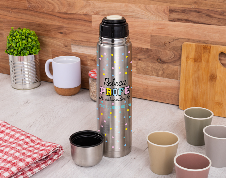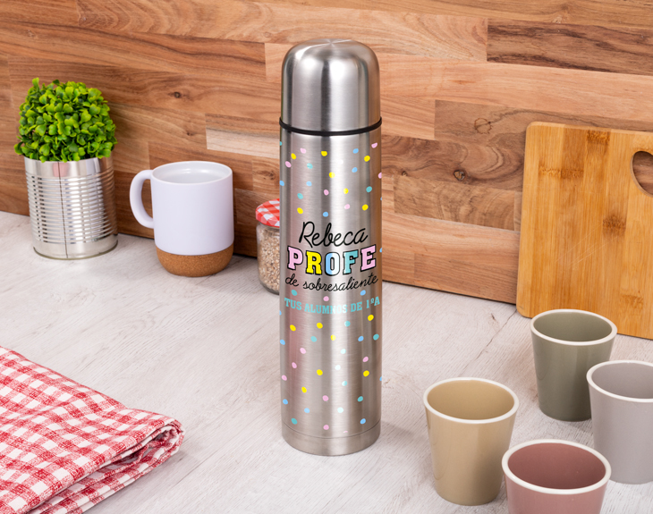 Ahora que llega fin de curso, es el mejor momento para mojarte un poco y ponerle nota a tu profe. ¿Cuál le pondrías? ¿Aprueba o suspende? Si tienes muy claro que tu profe es un sobresaliente en todos los aspectos, díselo con este termo personalizado. Es un regalo único y perfecto para profes, porque les servirá para llevar su bebida favorita a todos lados y mantenerse siempre bien hidratado o tener la energía para afrontar esos días tan agotadores. ¡Se quedará sin palabras! Si hay algo que no puede faltar en el día a día de los profes es un buen café. Es la mejor bebida para mantenerse despierto y con mucha energía. Por eso, si vuestro profe lo toma todos los días, este original termo de 1 litro es justo lo que necesita. ¡Tendrá reservas de sobra! Pero sin duda, lo mejor de este termo es que está hecho de acero inoxidable, es súper resistente y puede mantener las bebidas tanto frías como calientes durante mucho tiempo. Además, cuenta con un tapón hermético y un sistema de apertura y cierre con pulsación para evitar derramar el líquido del interior. ¡Es el termo perfecto! Sorprender a vuestro profe favorito es súper fácil. Solo tenéis que personalizar este termo tan especial. Añade el producto al carrito, entra en el área de personalización y escribe su nombre y una breve frase dentro de este precioso diseño que le encantará. Fíjate en la imagen que te dejamos o deja volar tu imaginación. Colócalo como quieras y el regalo ya estará listo para entregar. ¡Es perfecto para el último día de curso! Importante: No es apto para microondas, horno o lavavajillas. Altura de la botella: 32 cm. Diámetro de la base: 8 cm. Capacidad: 1 litro. Material: Acero inoxidable.