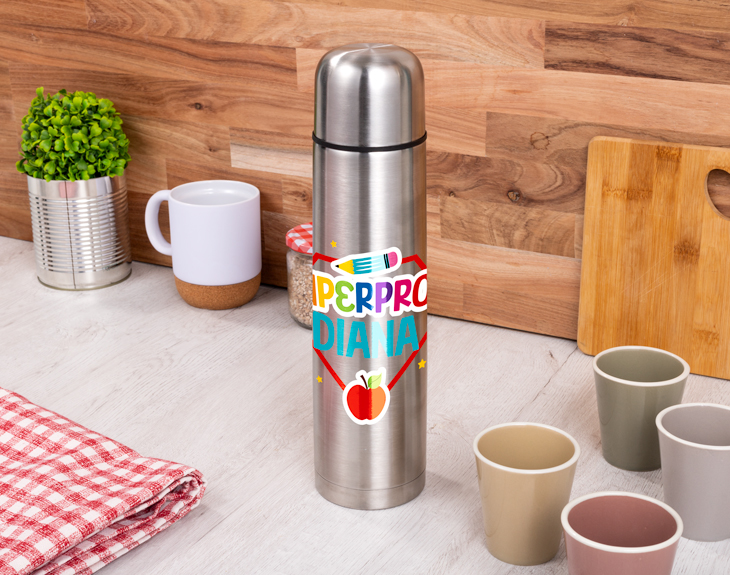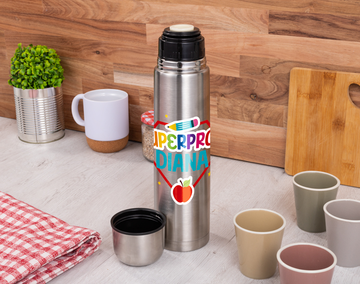 ¡Tener el mejor profe es genial! Y es que si este curso habéis tenido la suerte de tener un profe que lo ha dado todo, que os ha enseñado cosas muy interesantes, que ha tenido toda la paciencia del mundo y que además os ha ayudado a sacar las mejores notas... Se merece un regalo tan guay como nuestro termo personalizado. Su diseño es perfecto para decirle a vuestro profe que es un súper profe en todos los aspectos. ¡Le encantará! Si vuestro profe es de esas personas que no sabe vivir sin café y todo el día tiene una taza en la mano, no habrá mejor regalo que este original termo de 1 litro. Es el accesorio perfecto para poder llevar el café o la bebida que quiera allá donde vaya y tenerla siempre a mano para tener siempre mucha energía. Hecho de acero inoxidable, es súper resistente y puede mantener las bebidas tanto frías como calientes durante mucho tiempo. Pero lo mejor es que cuenta con un tapón hermético y un sistema de apertura y cierre con pulsación para evitar derramar el líquido del interior. ¡Es el termo perfecto para profes! Si queréis sorprender a vuestro profe con el regalo más especial del mundo, no os podéis olvidar de personalizar este termo. Solo hay que añadir el producto al carrito, entrar en el área de personalización y escribir el nombre de tu profe en el espacio vacío. Colócalo como quieras y el regalo ya estará listo para entregar. ¡Es genial para el último día de curso! Importante: No es apto para microondas, horno o lavavajillas. Altura de la botella: 32 cm. Diámetro de la base: 8 cm. Capacidad: 1 litro. Material: Acero inoxidable.
