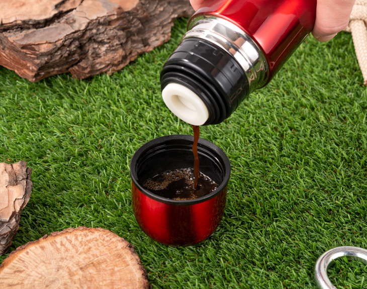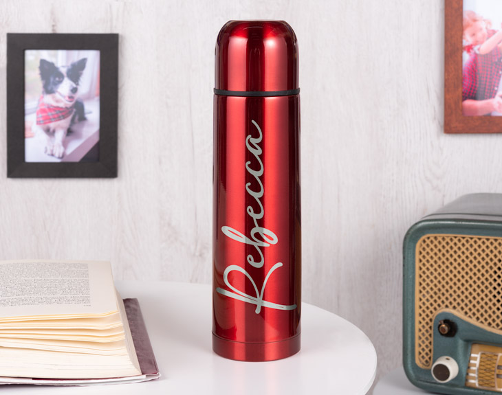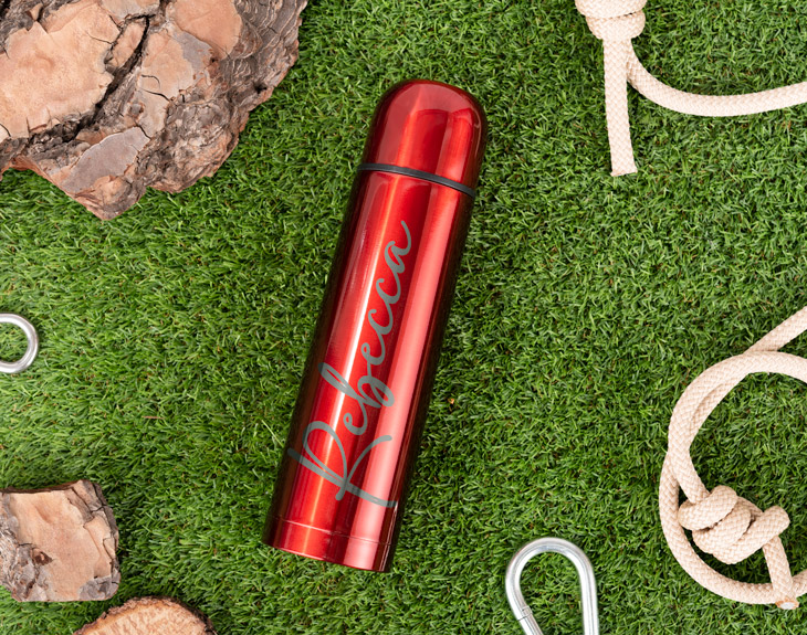• Termo metálico (450 ml). • Tarjeta Recordatoria. Un termo es uno de esos complementos que nunca pueden faltar, sobre todo si desayunas o comes fuera. En los meses más fríos te puede solucionar el día, manteniendo siempre calentito tu café como si estuviera recién hecho, pero tiene incluso más utilidades: llevarte agua hirviendo para calentar tu sopa instantánea a la hora de la comida, tener tu caldito o puré listo para consumir en cualquier momento. ¡Los termos no solo sirven para bebidas calientes! Si sientes que necesitas uno en tu vida, optar por este precioso termo personalizado es una excelente solución, ya que no solo es práctico, si no que tiene un diseño muy especial. El termo, como comentamos, está fabricado en aluminio, para que su interior no se deteriore con el tiempo o el uso. Externamente, cuenta con una capa de color rojo metalizado que le da un plus de decoración al regalo. Tiene una altura de 24,5 cm y un diámetro de 6,5 cm en su parte más ancha. Cuenta con una tapa exterior a rosca que incluso podrías usar como vasito si fuera necesario. También tiene un cierre interior a rosca que puede pulsarse para que el líquido salga sin tener que abrirlo totalmente. En este producto, recomendamos su lavado a mano ya que la capa exterior puede dañarse con los lavados agresivos de un lavavajillas. ¡Así se conservará como el primer día! En cuanto a la personalización, este regalo se diseña con el nombre o texto breve que desees. Solo tendrías que indicarlo durante el paso de personalización y nosotros lo grabamos posteriormente a láser sobre uno de los lados del termo. ¡El resultado es simplemente espectacular!