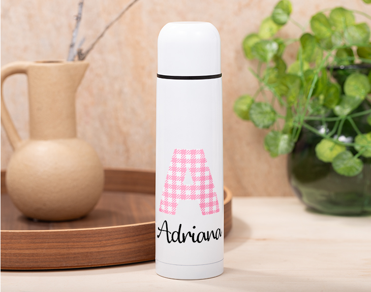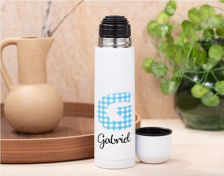 Si quieres que tu hijo tenga su propia botella para beber donde quieras y que además, sea respetuosa con el medio ambiente, este termo con vasito "Alfabeto Vichy" es perfecto para que deje de usar botellas de plástico. Es ideal para transportarlo donde quieras porque tiene el tamaño perfecto y es súper ligero. Este termo personalizado es perfecto para mantener la temperatura de las bebidas mucho más tiempo. Y la tapa puede funcionar como un vasito para que se pueda beber fácilmente. Aunque lo mejor de este termo es que es personalizable. Podrás escribir el nombre de esa persona tan especial y escoger una inicial de nuestro Alfabeto Vichy. Es genial para que se mantenga bien hidratado en su día a día. Personalizar este termo con vasito es súper sencillo. El primer paso a seguir consiste en añadir el producto al carrito y entrar al área de personalización. Una vez ahí, ya puedes escribir el nombre que tú quieras y poner la inicial de nuestro Alfabeto Vichy. Pronto estará perfecto y listo para regalar. ¡Será un original regalo! Material: aluminio Altura: 25 cm Capacidad: 450 ml