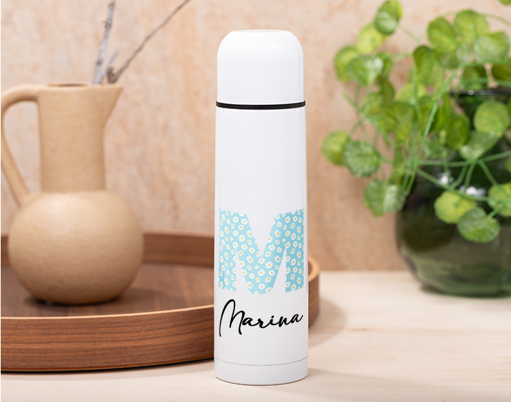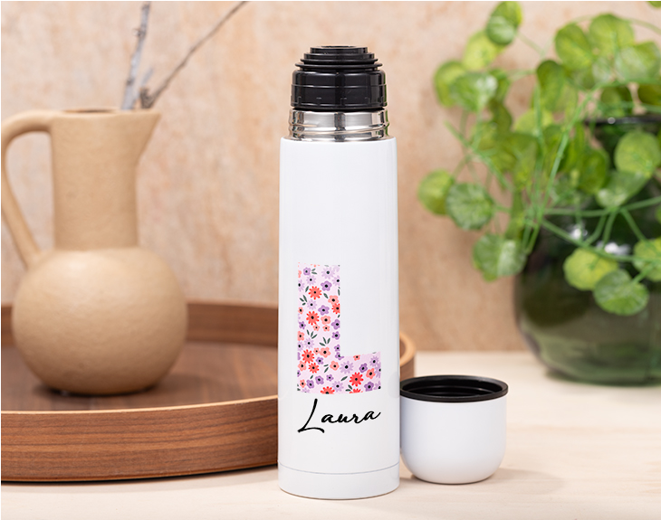 ¿Buscas sorprender a esa persona tan ocupada que siempre se pasa el día fuera de un lado para otro? Tenemos la opción perfecta, se trata de nuestro termo con vasito "Familia Florecitas". Es perfecta para que se lo lleve siempre consigo y así mantenerse bien hidratado en su ajetreado día. Este termo personalizado es perfecto para mantener la temperatura de las bebidas mucho más tiempo. Y la tapa puede funcionar como un vasito para que se pueda beber fácilmente. Aunque lo mejor de este termo es que es personalizable. Podrás escribir el nombre de esa persona tan especial y escoger una inicial de nuestro alfabeto de flores. Personalizar este termo con vasito es súper sencillo. El primer paso a seguir consiste en añadir el producto al carrito y entrar al área de personalización. Una vez ahí, ya puedes escribir el nombre que tú quieras y poner la inicial de nuestra familia Florecitas. Pronto estará perfecto y listo para regalar. ¡Será un original regalo! Material: aluminio Altura: 25 cm Capacidad: 450 ml