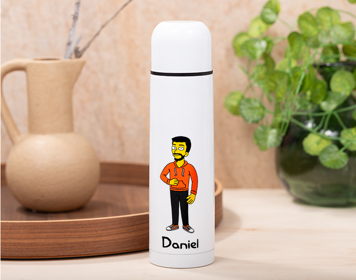 ¿Conoces a esa persona súper fan de la serie de Los Simpson? Si esta es su seria favorita, está claro que esto le va a encantar. Se trata de nuestro termo con vasito "Familia Simpson". Es ideal para que se lo lleve allá a donde vaya y siempre se mantenga bien hidratado. ¡Podrá llevarse siempre un café o su bebida favorita! Imagina la ilusión que le hará verse como un auténtico habitante de Springfield. Sin duda, le encantará. Y es que lo mejor de este termo con vasito es que es personalizable, esto quiere decir que tú eres quien crea al avatar del estampado como tú quieras. hay un montón de accesorios y rasgo diferentes para elegir,s eguro que consigues que este persona le represente. Personalizar este termo con vasito es súper sencillo. El primer paso a seguir consiste en añadir el producto al carrito y entrar al área de personalización. Una vez ahí, ya puedes crear a este avatar desde cero como tú quieras, ¡ya verás qué divertido! Pronto estará perfecto y listo para regalar. ¡Será un original regalo para los fans de los Simpson! Material: aluminio Altura: 25 cm Capacidad: 450 ml