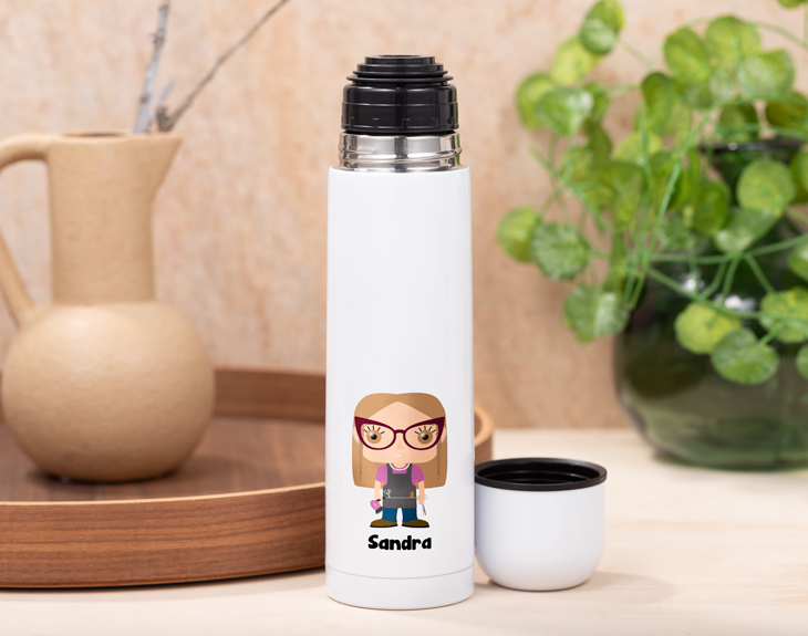 Haz completamente tuyo este termo con vasito personalizado. Además de poner tu nombre, puedes convertirte en Tinok. ¡Escoge entre los más de 450 prototipos que te ofrecemos! Así no habrá confusiones. Además de este característico diseño, el termo mantendrá la temperatura de cualquier bebida que le eches. Ya sea que tomes café, té, agua... podrás hacerlo con estilo. Además, podrás tomártelo en el trabajo o en el gimnasio, gracias a que la tapa te servirá como vasito también. Lleva este termo siempre contigo y tendrás tu diseño único y un complemento útil. ¡No se te saldrá nada gracias al cierre con rosca! Material: aluminio Altura: 25 cm Capacidad: 450 ml Importante: nuestro equipo de personalización se encargará de ajustar la distribución de los personajes en el producto en función de su tamaño para que se vean lo mejor posible.
