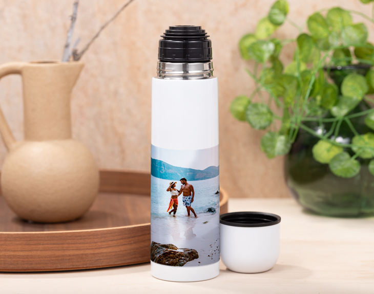 El regalo perfecto para esas personas que se pasan el día bebiendo café o té. Con este termo personalizado podrá mantener la temperatura de sus bebidas durante mucho más tiempo. Puedes personalizarlo con una foto muy emotiva o divertida, con su nombre o incluso con un logo...¡Así podrá presumir de termo allá donde vaya! La tapa es también un vasito para que pueda beber fácilmente en cualquier lugar. Además,tiene un cierre con rosca que garantiza poder guardarlo en un bolso o mochila sin miedo a que se derrame....¿No te parece una idea increíble! Material: aluminio Altura: 25 cm Capacidad: 450 ml