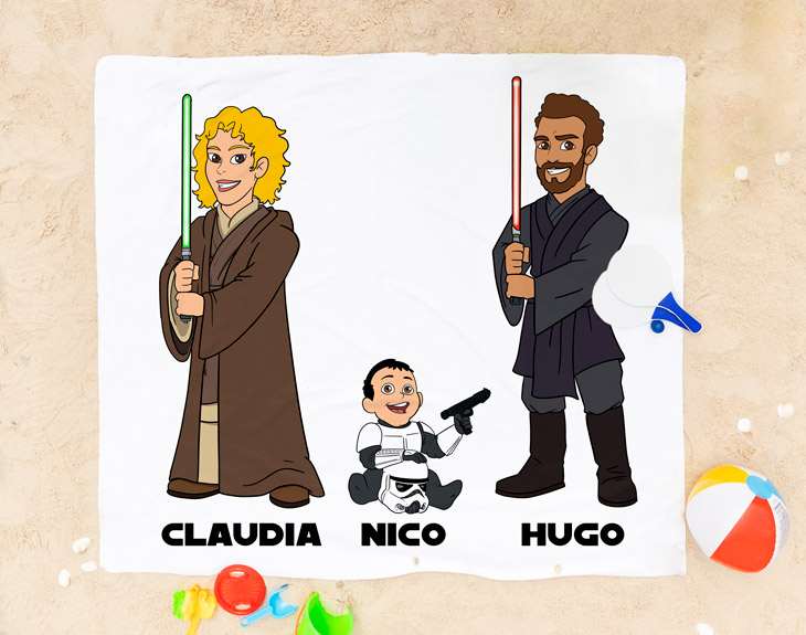 Si vas a la playa o la piscina, que sea con esta toalla personalizada de Star Wars. En ella podrás convertirte en un personaje de la saga galáctica y ser el que tenga la toalla más chula en kilómetros a la redonda. Elije entre miles de personajes y crea una toalla en la que tú, tu familia o las personas especiales a las que quieres sorprender os convertís en personajes de Star Wars. Jedi, Sith, Ewoks... ¡tenemos hasta gungans! Material: Microfibra, super-absorbente. Importante: a partir de 6 personajes, estos se distribuirán en dos filas en la toalla. Es decir: - Familia de 6 personajes: 3 en la fila superior, y 3 en la inferior. - Familia de 7 personajes: 4 en la fila superior, y 3 en la inferior. - Familia de 8 personajes: 4 en la fila superior, y 4 en la inferior.