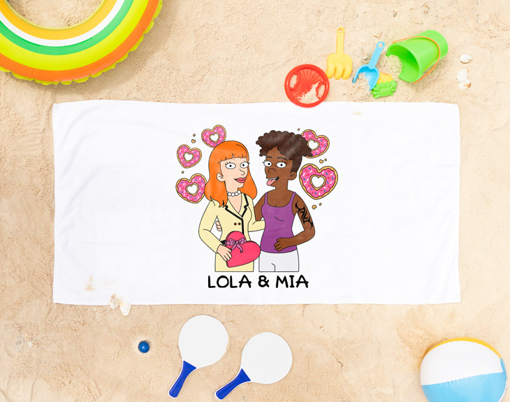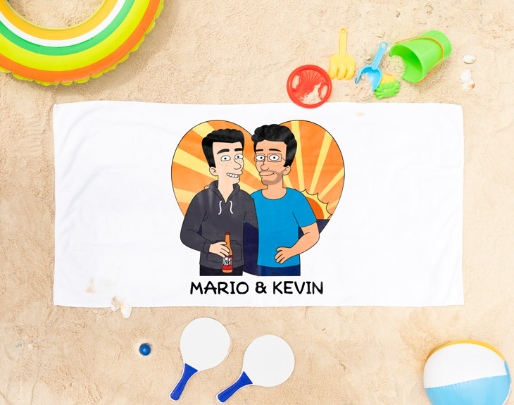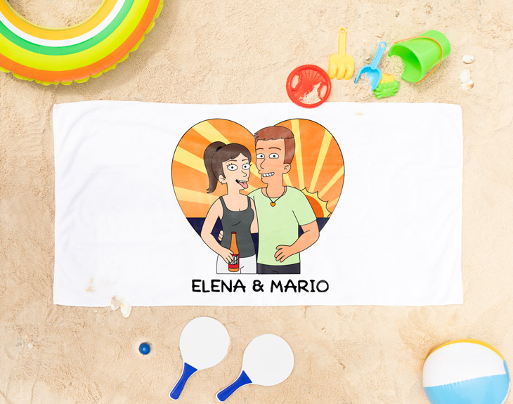 Todos acabamos encontrando a esa persona con la que compartimos un montón de cosas, como por ejemplo que os guste ver juntos todas las series de dibujos animados que hay en el mundo. Y es que compartir gustos y aficiones, tanto del uno como del otro, es amor verdadero. Por eso, si quieres sorprender a tu pareja con un regalo único y muy veraniego, hazlo con esta toalla personalizada. Con este accesorio tan guay podrá disfrutar de la playa o de la piscina siempre que quiera y ser el centro de todas las miradas allá donde vaya. ¡Le encantará! Si tú y tu pareja estáis enganchadísimos a cualquier serie de dibujos animados y disfrutáis de cada uno de sus capítulos, no hay nada como regalarle esta original toalla. Se quedará sin palabras cuando reciba este regalo tan único y diferente, hecho solo para él o ella. Lo mejor es que esta toalla podrá ser como tú quieras: individual, doble, de algodón o de microfibra. ¡Hay para todos los gustos! Sin duda lo más guay es poder personalizar esta toalla a tu medida. Elige qué tipo de toalla quieres, añade el producto al carrito y entra en el área de personalización. Un a vez ahí, podrás crear vuestros personajes con todos los detalles necesarios para que sean igualitos que vosotros. Os encantará veros como auténticos dibujos animados y ser los protagonistas de vuestra propia aventura. ¡Un regalo de lo más romántico! Especificaciones: - Toalla microfibra individual: 160 x 80 cm. - Toalla algodón individual: 140 x 79 cm. - Toalla microfibra doble: 160 x 180 cm. - Toalla algodón doble: 160 x 145 cm. Material de la toalla algodón: 100% poliéster en la parte impresa y 100% algodón en la parte inferior.