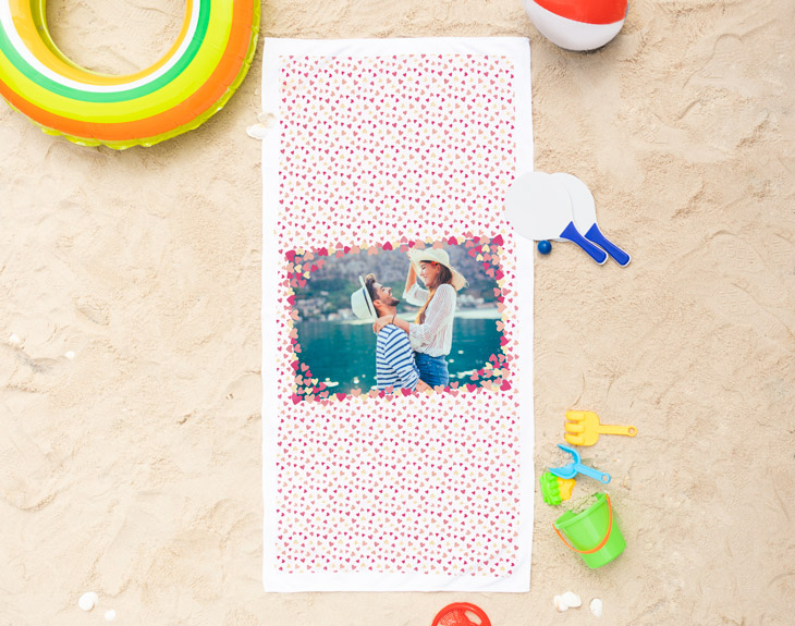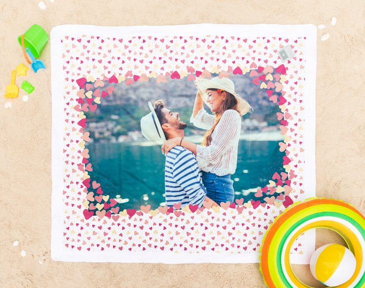 ¿Adoras las escapadas de verano junto a tu pareja? Si no hay nada que te guste más que ir a la playa o piscina juntos y disfrutar de un fantástico día de sol, playa y mucho amor, esta toalla personalizada está hecha para vosotros. Se trata de un regalo increíble para demostrarle que estás deseando que lleguen ya vuestras vacaciones juntos. Además, con esta toalla tan original serán incluso más especiales. Simplemente tienes que escoger vuestra foto más romántica o más divertida y la insertaremos en este diseño lleno de corazones. Así que ha llegado el momento de hacer un recorrido por todas las fotografías que tenéis juntos y elegir la más especial...¡Seguro que le gusta muchísimo! Material de la toalla algodón: 100% poliéster en la parte impresa y 100% algodón en la parte inferior.