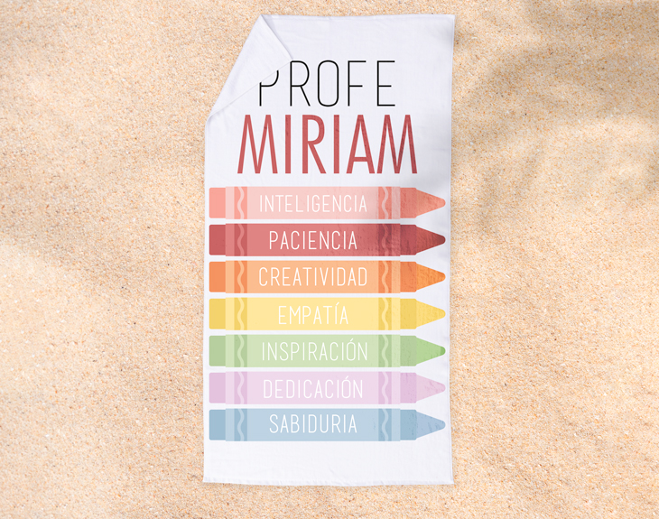 Por fin llega el verano, eso quiere decir que llegan la esperadas vacaciones. Seguro que tenéis un montón de ganas de hacer esos viajes y desconectar de la rutina. Aunque lo malo es que toca despedirse de los compañeros de clase y del profe. Si queréis hacerle al mejor profe del mundo un regalo de despedida, nuestra toalla personalizada con diseño "Crayones del profe" es ideal. ¡Nunca se olvidará de su clase favorita! Además, ahora que llega el calor, se acerca la época de los planes de playa o piscina. Por eso, esta toalla le vendrá de maravilla. Hay dos tamaños disponibles: individual o doble. Lo más especial, es que es personalizable, podrás escribir el nombre del mejor profe del mundo. Imagina la ilusión que le hará recibir esta toalla personalizada, le encantará. Personalizar esta toalla es muy sencillo. El primer paso a seguir consiste en añadir el producto al carrito y entrar al área de personalización. Una vez ahí, ya puedes escribir el nombre del mejor profe. Pronto estará perfecto y listo para regalar. ¡Será un original regalo para profes! Especificaciones: - Toalla microfibra individual: 160 x 80cm. - Toalla algodón individual: 140 x 79cm. - Toalla microfibra doble: 160 x 180cm. - Toalla algodón doble: 160 x 145cm. Material de la toalla algodón: 100% poliéster en la parte impresa y 100% algodón en la parte inferior.