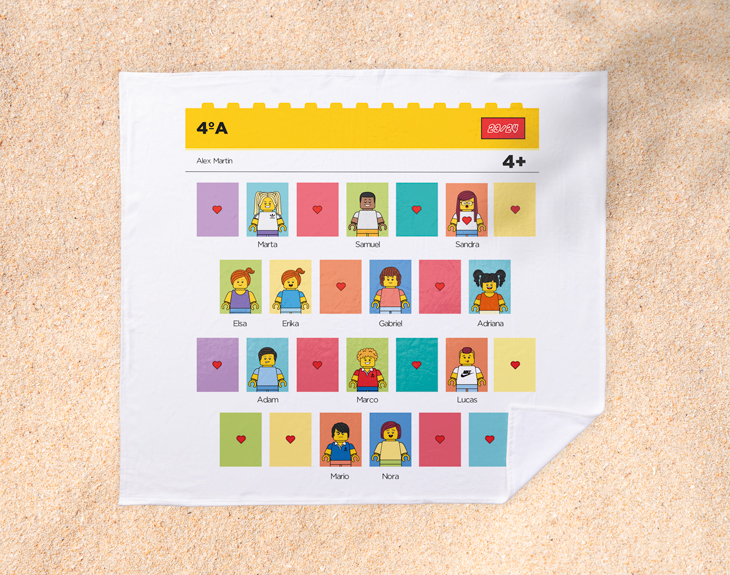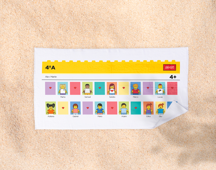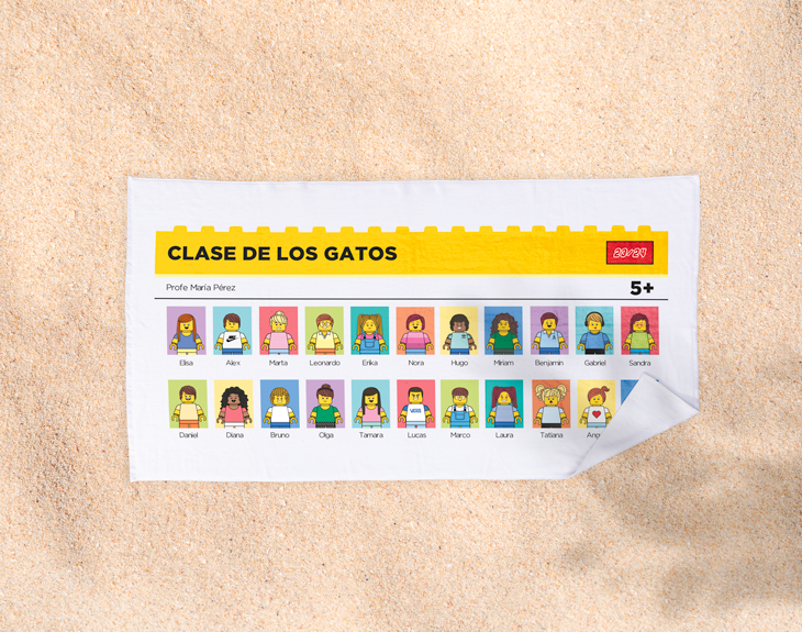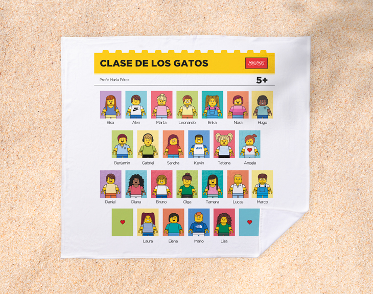 ¿Alguna vez has pensado cómo sería crear una orla pero con personajes de Lego? ¡Pues ha llegado el momento de hacer este deseo realidad! Con esta toalla personalizada podrás sorprender al mejor profe del mundo, porque su diseño es genial para dejarle sin palabras el último día de curso. Si todos los papis queréis agradecerle todo lo que ha hecho por vuestros peques, esta toalla es la mejor opción. Si juntamos fin de curso, un profe y unos alumnos que se tienen mucho cariño con el universo Lego, nos da como resultado este original regalo para maestros. Esta toalla es perfecta para disfrutar del verano y las vacaciones al máximo. Y lo mejor es que podrás elegir el modelo de toalla que más te guste: algodón, microfibra, individual o doble. ¡Hay para todos los gustos! Y el último paso es personalizar esta toalla para que sea un regalo único. Añade el producto al carrito y entra en nuestro diseñador. Lo único que tendrás que hacer es completar esta divertida orla con los personajes Lego que tú quieras. Podrás crearlos desde cero con todos los detalles que necesites y añadir texto en los espacios vacíos. ¡Así de sencillo es crear el mejor regalo del mundo para fin de curso! Especificaciones: - Toalla microfibra individual: 160 x 80 cm. - Toalla algodón individual: 140 x 79 cm. - Toalla microfibra doble: 160 x 180 cm. - Toalla algodón doble: 160 x 145 cm. Material de la toalla algodón: 100% poliéster en la parte impresa y 100% algodón en la parte inferior. Importante: Los huecos en los que no aparezca un personaje se incluirá un corazón.