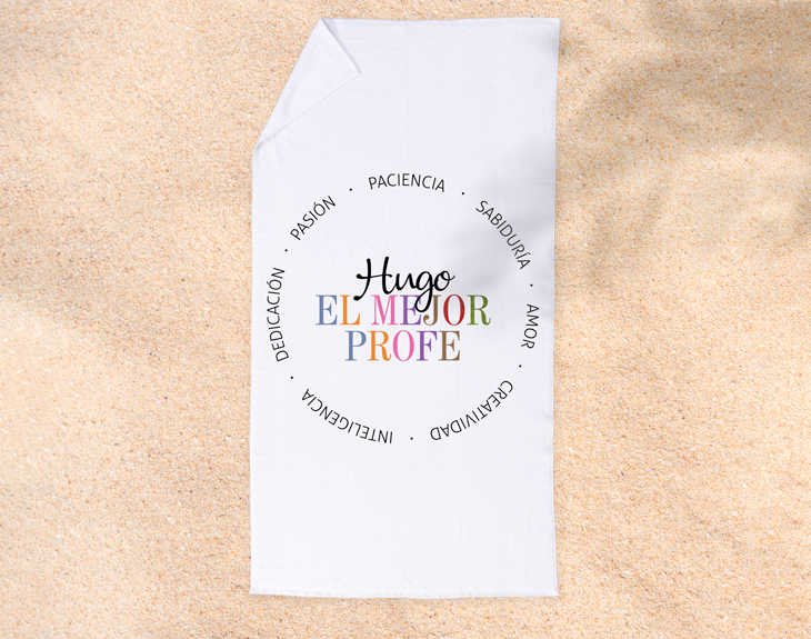 Seguro que se te ocurren muchas palabras con las que puedes definir a tu profe favorito: pasión, sabiduría, dedicación... Plasma todas ellas en el mejor regalo que hay para este fin de curso: ¡nuestra toalla personalizada! Si hay algo que conseguirá dejar sin palabras a ese profe que tanto os ha enseñado durante este curso, será esta toalla tan chula y diferente. ¡Es un regalo único! Si a vuestro profe le encanta disfrutar de la playa o la piscina cuando llega le verano, este original regalo es perfecto. Y lo mejor de todo es que podrás elegir el modelo de toalla que tú quieras: individual, doble, algodón o microfibra. ¡Tenemos para todos los gustos! Personalizar esta toalla es muy fácil y rápido. Añade el producto al carrito y entra en el área de personalización. Lo único que tendrás que hacer es completar este emotivo diseño para maestros con el nombre del tuyo. ¡Así de sencillo es crear el mejor regalo del mundo para fin de curso! Especificaciones: - Toalla microfibra individual: 160 x 80 cm. - Toalla algodón individual: 140 x 79 cm. - Toalla microfibra doble: 160 x 180 cm. - Toalla algodón doble: 160 x 145 cm. Material de la toalla algodón: 100% poliéster en la parte impresa y 100% algodón en la parte inferior.