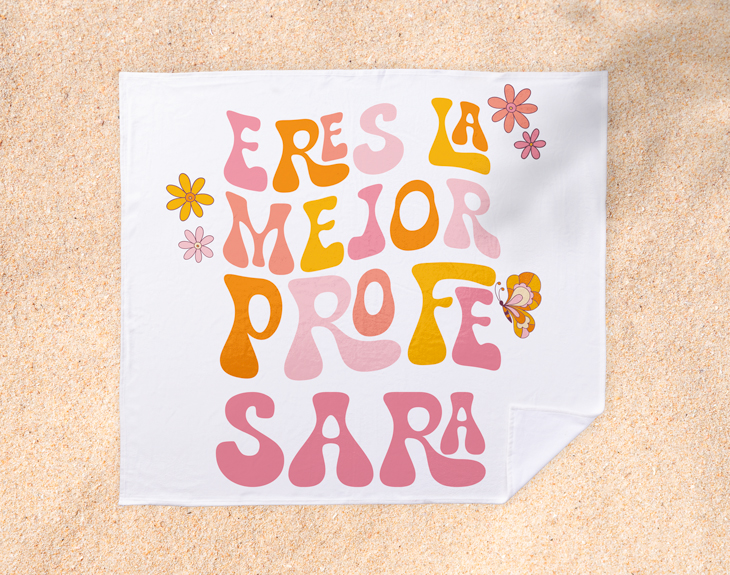 Si hay alguien que se merece unas vacaciones en condiciones, esa es vuestra profe preferida. Y es que, por mucho que adore su trabajo, seamos sinceros, ¡seguro que está deseando desconectar unas semanas! Por eso, si queréis hacerle un regalo original y práctico este fin de curso, nuestra toalla "Profe retro" tiene su nombre. Un diseño super divertido y colorido, perfecto para que disfrute de esos días de relax en la playa o piscina, ¡así volverá en septiembre con las pilas cargadas! Para personalizarla, solamente tenéis que escoger el tamaño de toalla que queráis, así como el color del diseño y el nombre de vuestra seño. ¡Del resto nos encargamos nosotros! Si queréis hacerle un detalle especial entre toda la clase, con esta toalla el acierto está asegurado. No hay una manera más especial y única de decirle que es la mejor o el mejor profe del mundo. Por toda su paciencia, su creatividad y su cariño, llegó el momento de agradecer todo lo que ha hecho por vosotros durante estos años. Especificaciones: - Toalla microfibra individual: 160 x 80cm - Toalla algodón individual: 140 x 79cm - Toalla microfibra doble: 160 x 80cm - Toalla algodón doble: 160 x 145cm Material de la toalla algodón: 100% poliéster en la parte impresa y 100% algodón en la parte inferior.