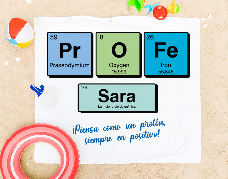 A todos nos ha costado aprendernos la tabla periódica en algún momento. Aluminio, calcio, litio, plomo... ¿Sabéis quién se sabe todos esos elementos químicos? ¡El mejor profe del mundo! Esta toalla personalizada le recordará todos los conocimientos que sabe. ¡Una toalla de lo más suave para descansar durante los meses de verano! No hay nada como relajarse en nuestra playa favorita después de los largos meses del curso. ¡Por eso esta toalla con diseño para profes es perfecta para ese maestro que se ha ocupado de enseñarle a sus alumnos todo lo que sabe! Podrás escoger entre una toalla individual (de 160 x 80 centímetros) o una doble (de 160 x 180 centímetros), dependiendo de la medida que prefieras para ese grandísimo profe. Un regalo original de fin de curso tiene que ser tan emotivo como útil... ¡Y no habrá nada más apropiado para la llegada del verano que esta toalla con diseño de tabla periódica! Está hecha especialmente para el profe. Escoge el producto que quieras y añádelo al carrito. Ahí podrás entrar en el área de personalización y personalizar la toalla con el diseño cuyo color más te atraiga. Clica sobre el cuadro de texto para personalizarlo, escribiendo el texto o nombre que quieras. Las toallas están disponibles en dos materiales: algodón, más gorditas y suaves; y microfibras, más finas y absorbente. Material de la toalla algodón: 100% poliéster en la parte impresa y 100% algodón en la parte inferior.