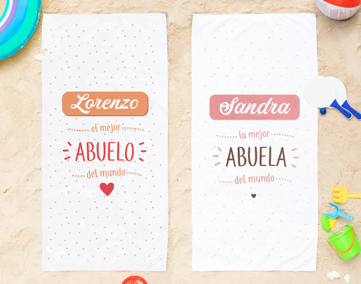 ¿Te encanta ver cómo en verano tus abuelos se dan la mano y bajan juntos a la playa? ¿En tu familia se va mucho a la playa o a la piscina y os lleváis a los abuelos? Es un buen momento para darles una sorpresa de la que no se olvidarán jamás. Estas toallas individuales para parejas son perfectas para sacarles una sonrisa y para que tus abuelos vayan juntos y muy orgullosos a la playa o la piscina. Solo necesitamos el nombre de tu abuelo y el de tu abuela para poder diseñar las toallas tal y como se puede ver en la foto del producto. ¿Todavía estás dudando? Son toallas de muy buena calidad que, además, puedes elegir en dos materiales distintos: algodón y microfibra. ¡Es un regalo original perfecto para los mejores abuelos del mundo! Material de la toalla algodón: 100% poliéster en la parte impresa y 100% algodón en la parte inferior.