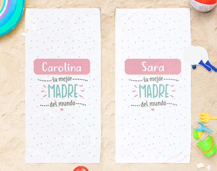 ¿Tienes las dos madres más buenas y cariñosas del mundo? ¡Qué suerte tienes! Y qué suerte van a tener ellas en cuanto te decidas a hacerles esta sorpresa tan original: dos toallas individuales para parejas personalizadas con los nombres de ambas. Si son mucho de ir a la playa, si cada verano están buscando un destino distinto de costa, estas toallas personalizadas les van a encantar. Solo necesitamos el nombre de cada una para poder personalizar las toallas tal y como se ve en la foto del producto. Aprovecha la oportunidad y dales una sorpresa inolvidable. Espera al Día de la Madre, o sus cumpleaños, o si no, hazles un buen detalle al principio del verano. ¡Será un día precioso y lleno de amor y cariño! Material de la toalla algodón: 100% poliéster en la parte impresa y 100% algodón en la parte inferior.