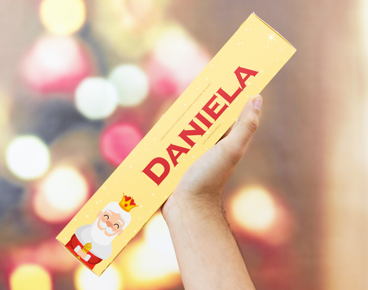 ¿Qué le vas a pedir este año a los Reyes Magos? Seguro que toda la familia tiene muchísimas peticiones para los tres reyes de oriente. Los pequeños querrán sus juguetes preferidos, mientras que loas mayores estarán deseando un ordenador, ropa... ¡O puede que algo de dinero! Eso sí, todos queremos una cosa por Navidad: chocolate. ¿A quién no le gusta tomar un poco de este delicioso manjar durante la época navideña? Tenemos el producto perfecto para que pases una Navidad de los más dulce: este toblerone gigante personalizado será el mejor regalo de los Reyes Magos. Este toblerone navideño personalizado tiene un peso de 360 gramos, y podrá ser personalizado con el nombre de cualquier amigo o miembro de tu familia. Además, podrás escoger qué rey mago te gustaría que apareciera en la etiqueta. ¿Siempre has sido más de Melchor, Gaspar o Baltasar? ¡Entra en el apartado de "ver más diseños" y escoge el que más te guste para tu regalo original de Navidad! Dimensiones: 31 x 6 x 6 cm. Peso: 360g.