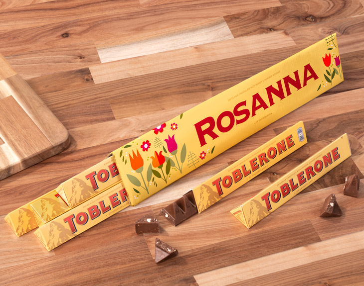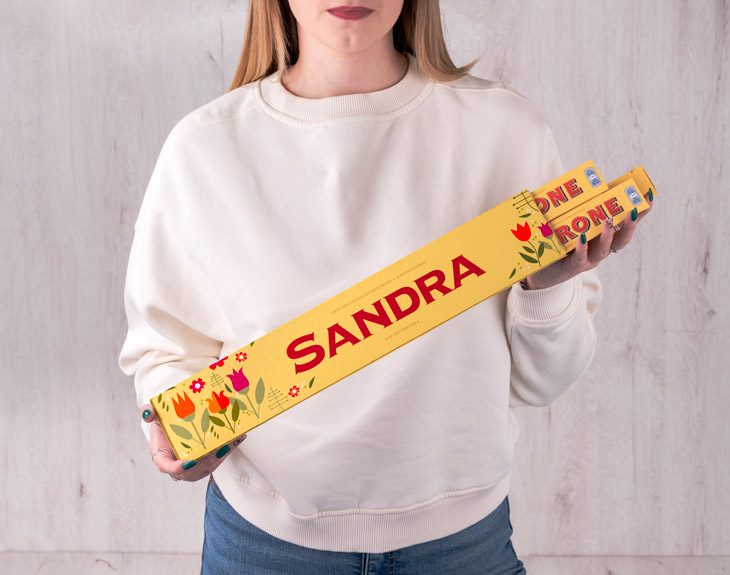 Regalar flores a nuestras madres está genial porque son un regalo precioso y que hace que el rincón donde se pongan, sea muy especial. Pero si quieres innovar y te apetece apostar por algo diferente pero igual de emotivo que un ramo de flores, este toblerone XL personalizado lleno de preciosas flores es la opción perfecta. Una tableta gigante del mejor chocolate con leche suizo es todo lo que nuestra madre necesita para saber que es la mejor y la más dulce del mundo. Si el envoltorio de este regalo le encanta, el interior va a hacer que se quede sin palabras. El Día de la Madre, su cumpleaños, un aniversario... No importa el momento o el día para regalarle este precioso detalle. Con esta original tableta XL de toblerone acertarás seguro, porque es el regalo perfecto para las mamás más golosas del mundo a las que les gusta disfrutar de un trocito de chocolate de vez en cuando. Por eso, no se podrán resistir a lo que hay en su interior: ¡8 tabletas de toblerone de 100 gramos cada una! Pero para que tu madre sepa que para ti es la mejor del mundo, queremos que puedas personalizar este toblerone XL solo para ella. Podrás elegir que quieres escribir en cada lado de la caja: su nombre tres veces, varios nombres o incluso una pequeña dedicatoria. ¡Hazle a mamá el regalo más dulce y floral del mundo entero! Medidas: 42,5 x 8 cm. Relleno: 8 tabletas de Toblerone de 100 gr.