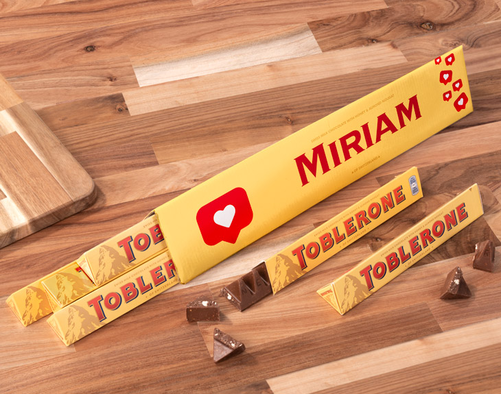 Seguro que hay alguien que ha conseguido robarte el corazón y no salir de tu cabeza y sentir eso, es una sensación única en el mundo. Cuando te gusta alguien sientes mariposas en el estómago y quieres gritarlo a los cuatro vientos, ¿verdad? Pues si estás en ese momento en que quieres decirle a alguien lo mucho que te gusta de una manera diferente y muy dulce, hazlo con este toblerone XL personalizado. Con este súper detalle, te ganarás el corazón de esa persona tan especial y que tanto quieres. ¡Con este toblerone sabrá lo mucho que te gusta! Si tu persona favorita es la más golosa del mundo y amante del chocolate, seguro que le encanta recibir esta original tableta XL de toblerone con un mensaje de lo más bonito y romántico. Seguro que se sorprende con el envoltorio de esta gran tableta, pero no se va a poder resistir a lo que hay en el interior de ella: ¡8 tabletas de toblerone de 100 gramos cada una! El regalo más dulce que le puedes hacer a tu persona favorita en el mundo. ¡Le encantará! Pero para que esa persona sepa de dónde viene este regalo y lo que le quieres decir, primero tendrás que personalizar este toblerone XL. ¡Es muy fácil! Añade el producto al carrito y comienza a crear tu diseño. Podrás poner el mismo nombre, añadir varios o incluso una breve frase de amor en cada uno de los lados de la caja. ¡Será el regalo más dulce del mundo! Medidas: 42,5 x 8 cm. Relleno: 8 tabletas de Toblerone de 100 gr.