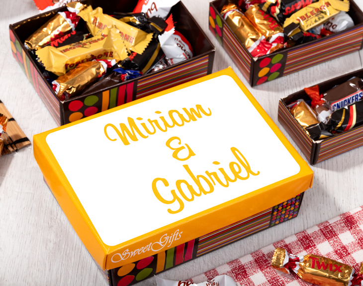• Torre de chocolates personalizada (4 cajas de cartón) • Surtido de chocolatinas. • Tarjeta Recordatoria.